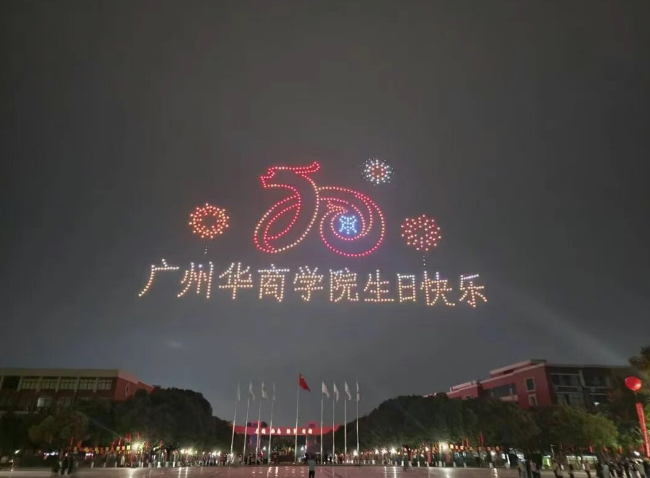 夜幕降临,在广州校区中央图书馆操场上,无人机表演惊艳亮相!1000架无人机在空中编队飞行,以《二十正青春 华商向未来》为主题,从创校之光、立校之魂、育人之基、奋进之路、攀登之梯、美育之果、拥抱之姿、笃行之力、办学魂等字样与图案,灯光在夜空中勾勒出母校的发展轨迹与美好愿景,引得现场掌声雷动、尖叫不断,将活动氛围推向高潮。